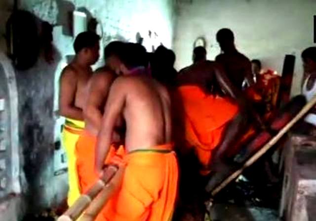 Since it would have been difficult for the women to lift those five black stone idols, weighing 1.5 tonnes each, five men went into the inner rooms and shifted the deities to Bagapatia. The women priests, who conduct daily rituals and tasks, then performed the ‘purifcation’ ritual.