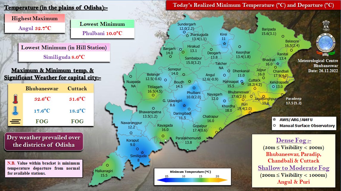The IMD further said that very dense fog was observed at Bhubaneswar, Cuttack, Chandbali, and Paradip. Angul and Puri experienced shallow fog.