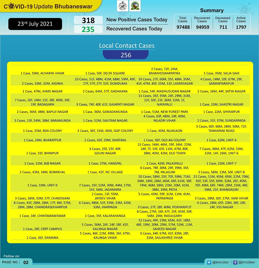 Of the local contact cases, 21 are from Khandagiri, followed by 20 from Patia, 15 from Old Town, 12 from Saheed Nagar, 11 from Nayaalli, and 10 each from Dumduma and Laxmisagar.