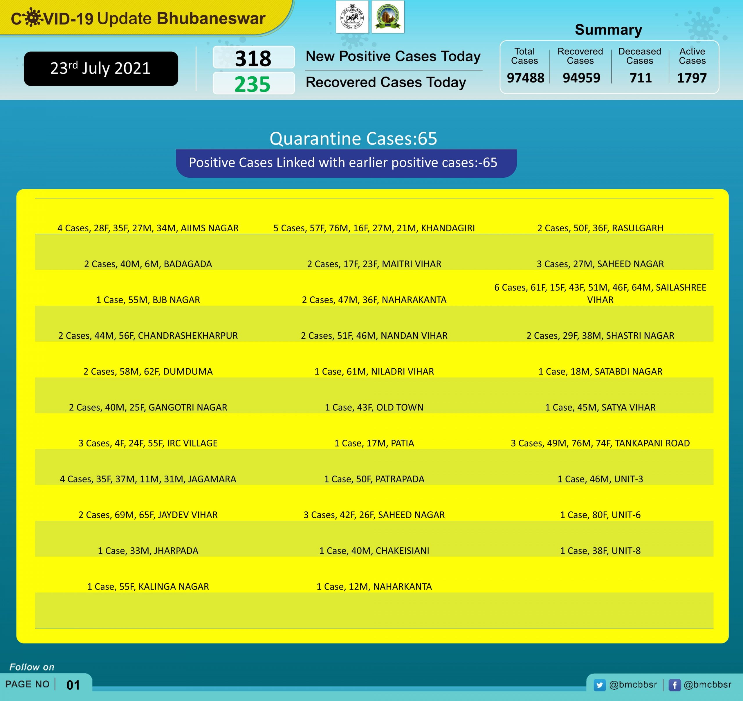 According to Bhubaneswar Municipal Corporation (BMC), 65 of the new infections are from quarantine and 256 local contacts.