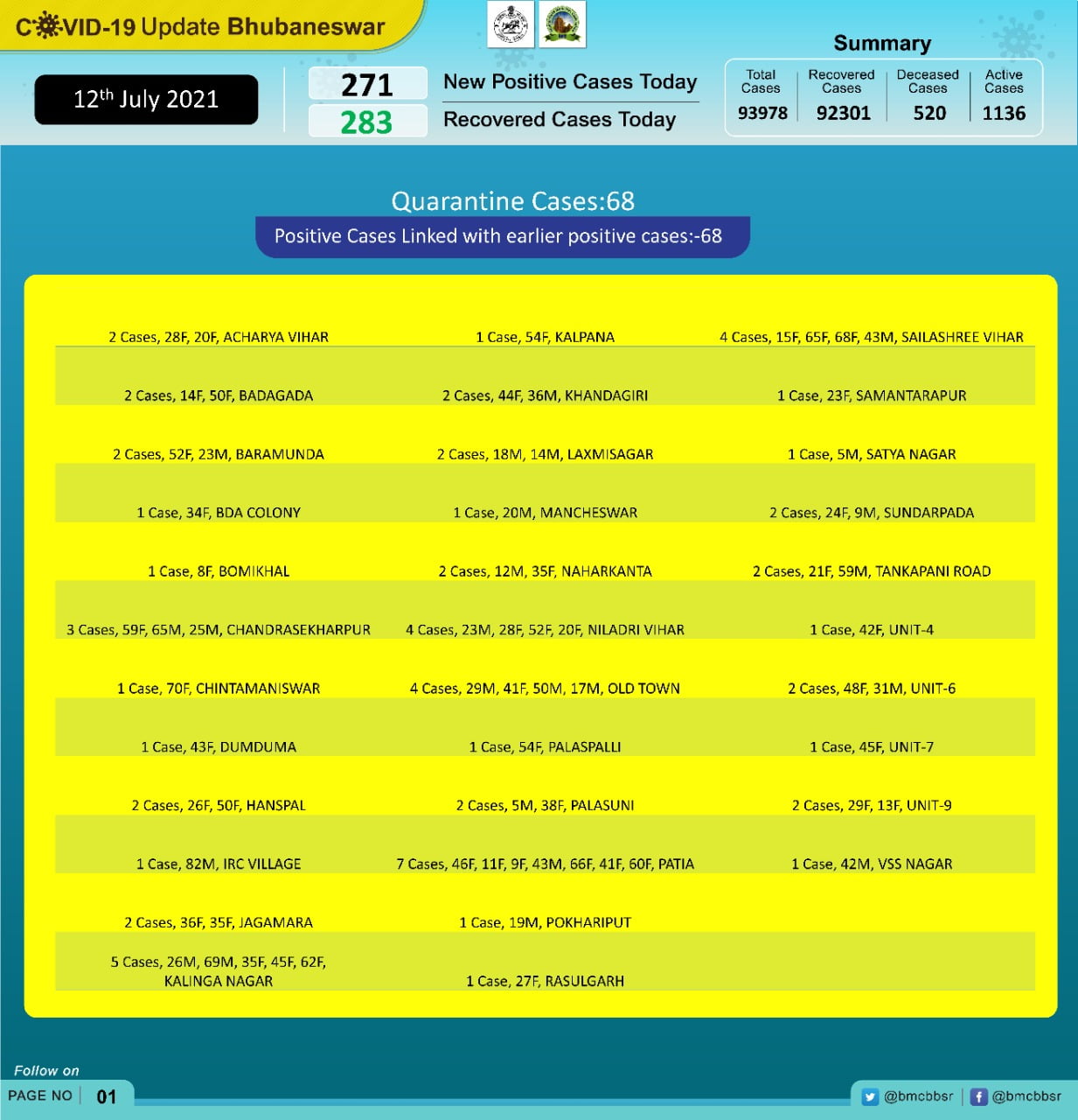 Of the new cases, 68 were from quarantine and 203 were local contacts, Bhubaneswar Municipal Corporation (BMC) stated in its tweet.