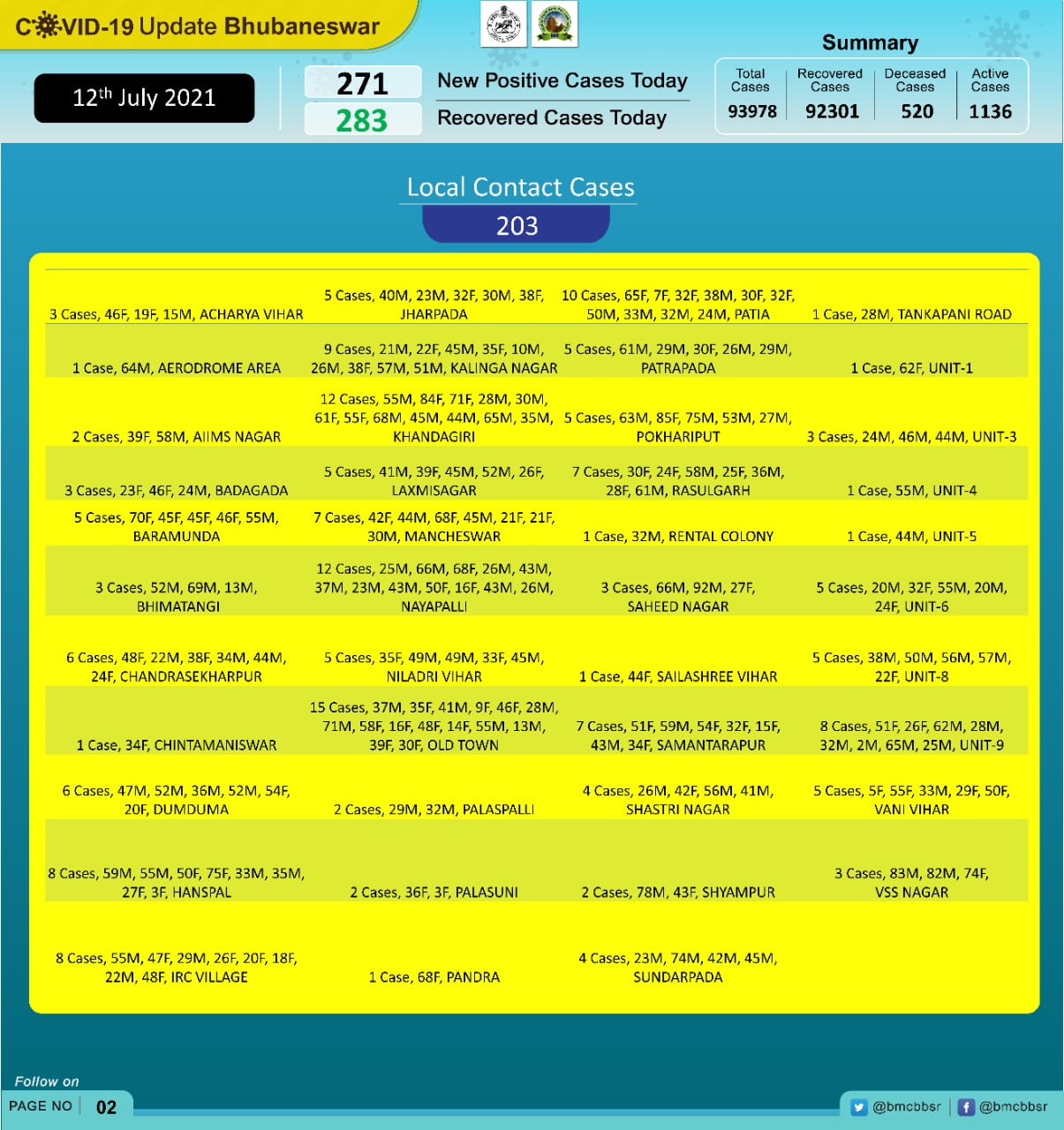 Of the local contact cases, Old Town registered highest of 15 cases, followed by Khandagiri and Nayapalli (12 each) and Patia (10).