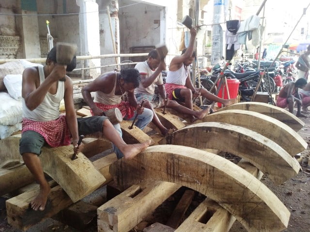2. Seven groups of workers are involved in making the chariots in their entirety. They are, Viswakarma or Maharana, who do the actual construction; Karati or carpenters who help cut the wood; Bhois who carry the wood and assemble it; Lohara, or blacksmith who work with iron, the Roopkars or wood carving artistes who create sculptures around the chariot; the Chitrakars or painters, who make different motifs and paint the chariots and Darji or the tailors who work on the cloth pieces used in the chariots.