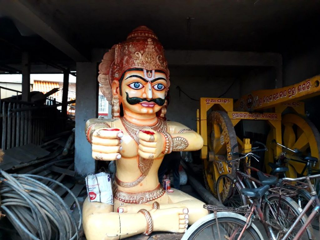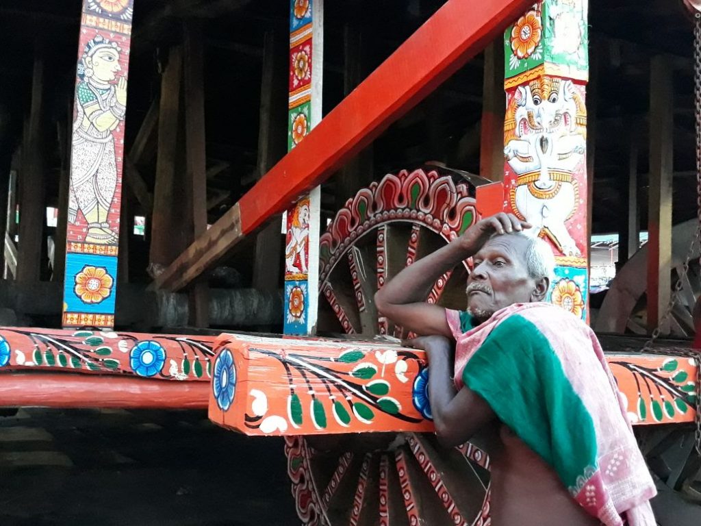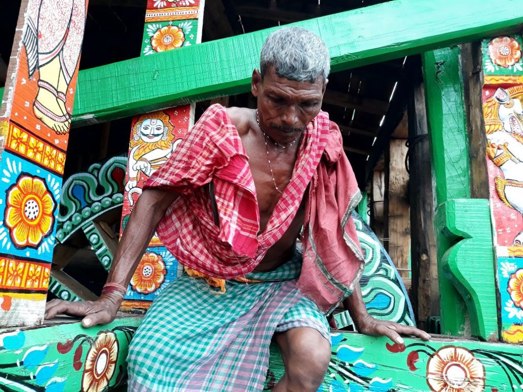 He, along with 77 other Bhois are a part of the assembling team of the chariot. In an exclusive chat with Odisha Bytes prior to the festival, Rabi not only told us about the process of making the chariot but also took us to the spot where wood was being chopped and ‘sarathi’ being painted. We walked across the Grand Road where the chariots were being decorated. He explained the tit-bits of the process very patiently. His eyes sparkled with passion and kept us hooked to the entire tale of chariot making.