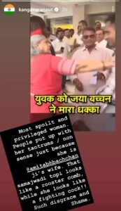 “Most spoilt and privileged woman. People put up with her tantrums/non-sense just because she is Amitabh Bachchan ji’s wife. That Samajwadi topi looks like a rooster comb, while she looks like a fighting cock!! Such disgrace and shame,” Kangana wrote on her Instagram handle.