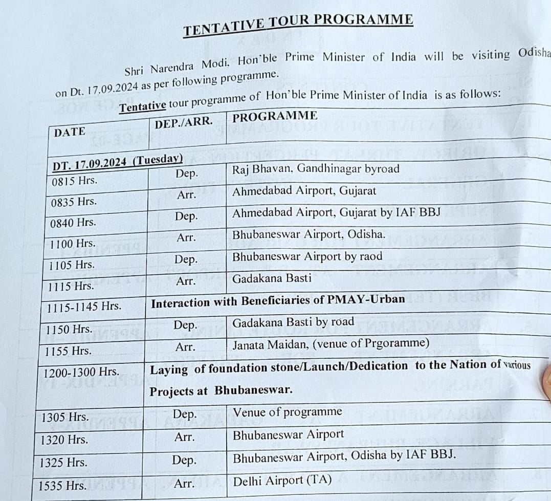 As all are eagerly waiting for the high-profile visit, detailed tour programme of Modi is now available. As per the itinerary, the Prime Minister is scheduled to arrive at Biju Patnaik International Airport IBPIA) in Bhubaneswar by a special plane at 11 am on Tuesday, sources said.