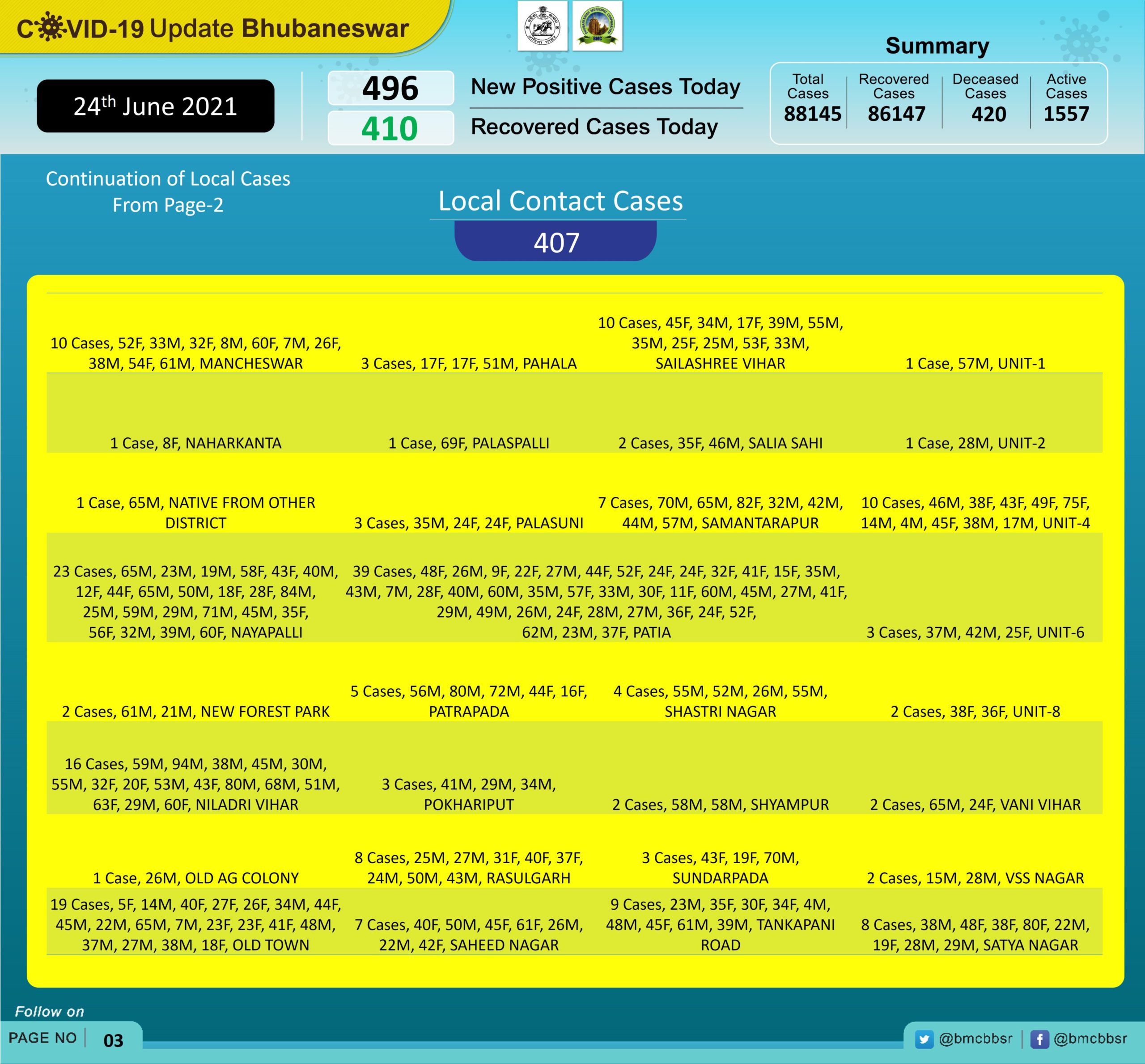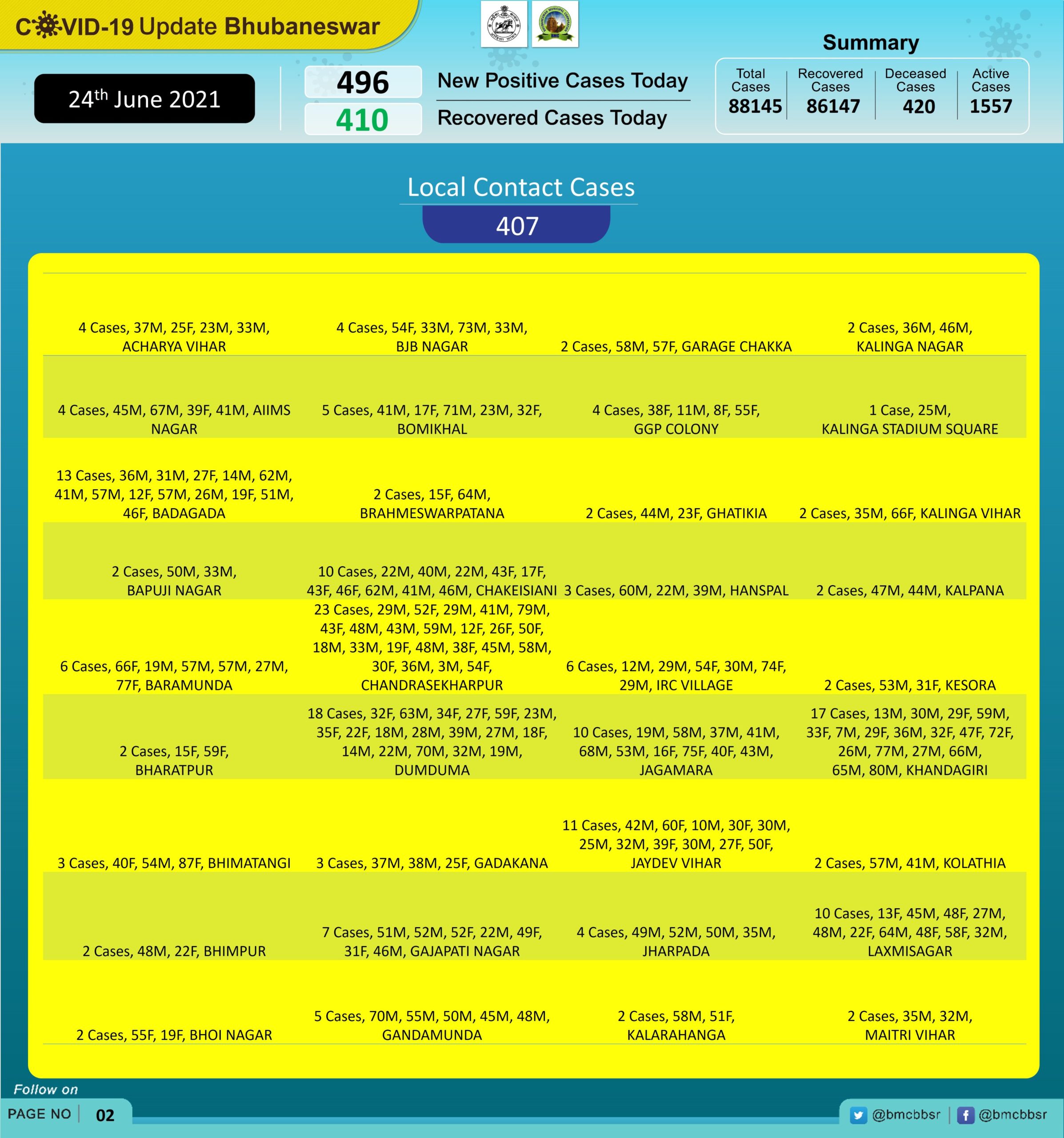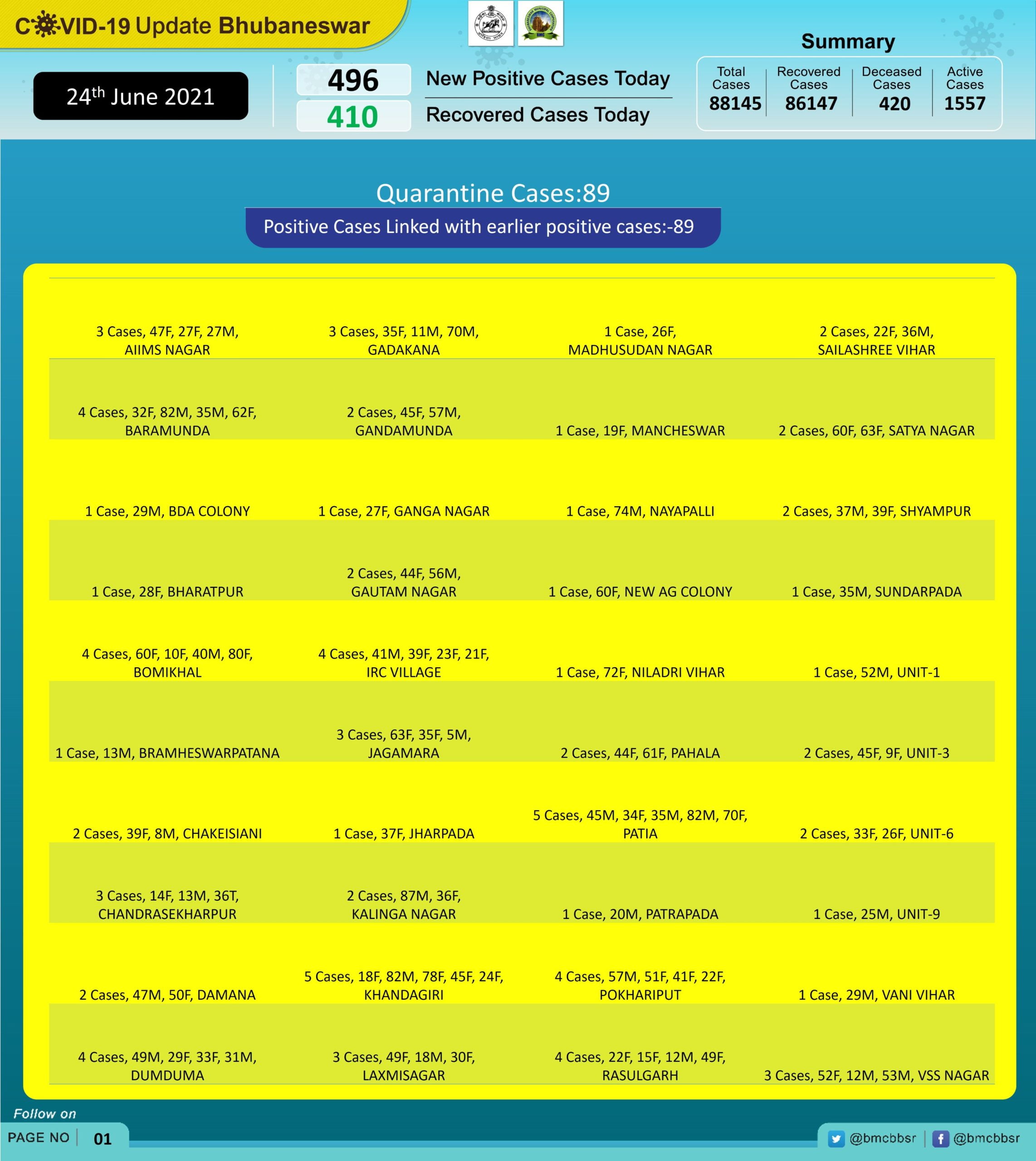 Of the new cases, 89 were from quarantine and 407 local contacts, Bhubaneswar Municipal Corporation stated in its tweet.