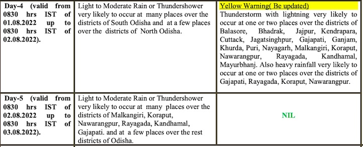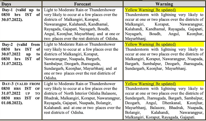 Rain in likely at a few places in Malkangiri, Koraput, Nabarangpur, Kalahandi, Kandhamal, Rayagada, Gajapati, Nayagarh, Boudh, Angul, Keonjhar, Mayurbhanj and at one or two places in rest of Odisha during the next 24 hours. Thunderstorm with lightning is also at one or two places in Malkangiri, Koraput, Nabarangpur, Kalahandi, Kandhamal, Rayagada, Gajapati, Nayagarh, Boudh, Angul, Keonjhar and Mayurbhanj during this period, the MeT office said.