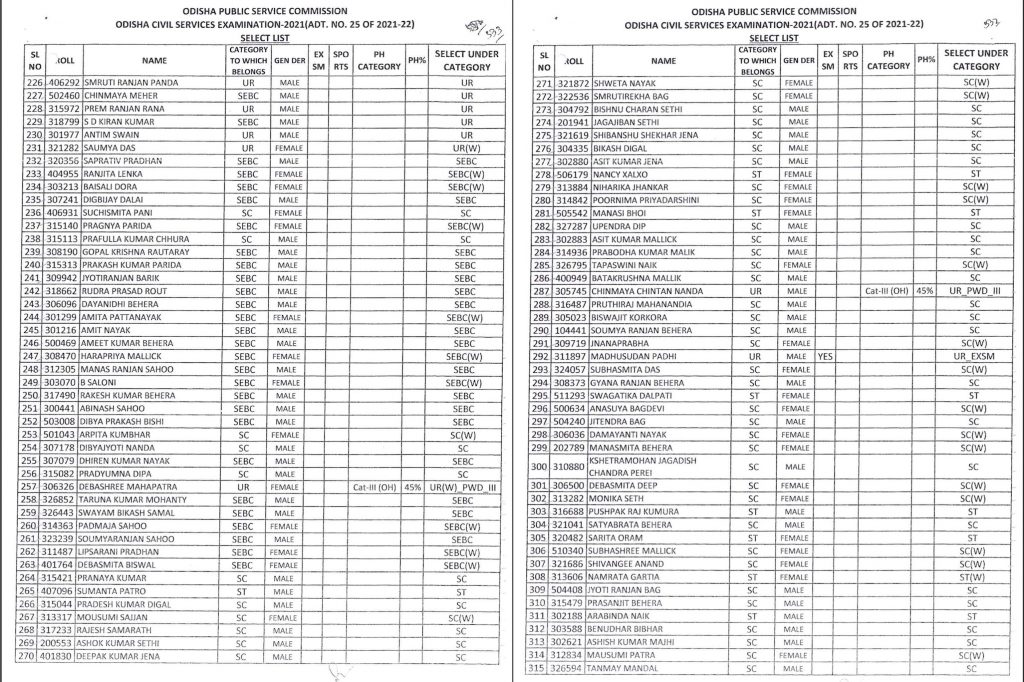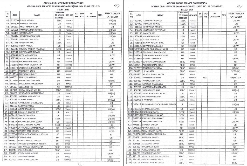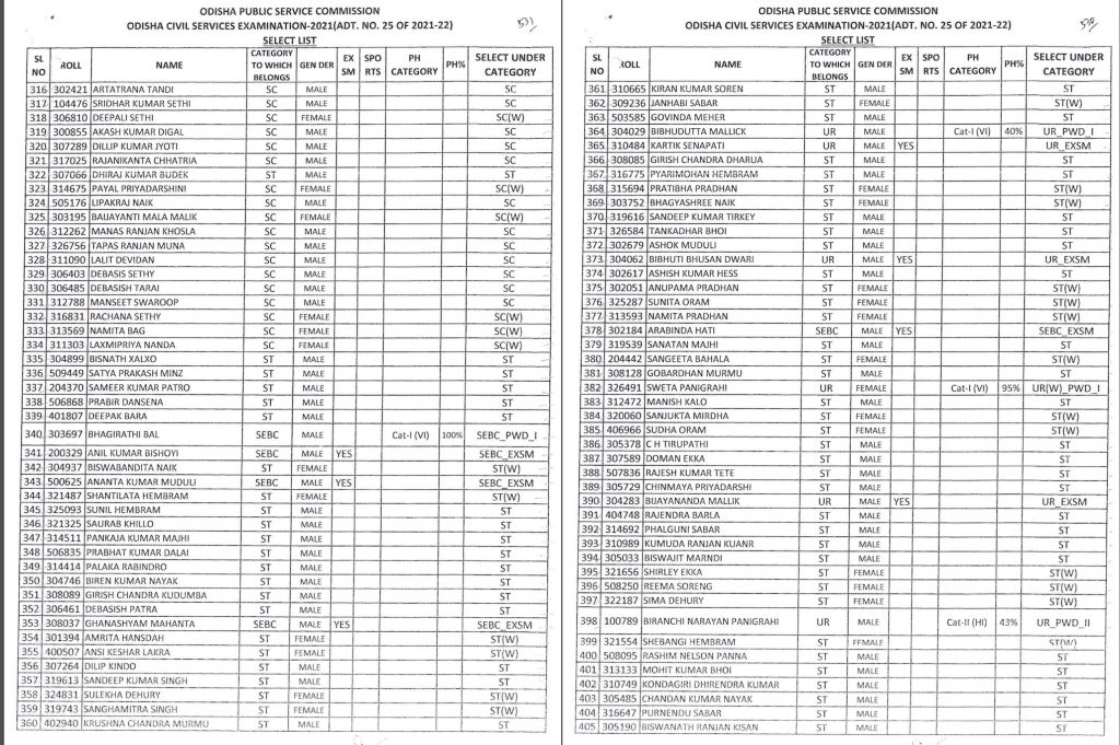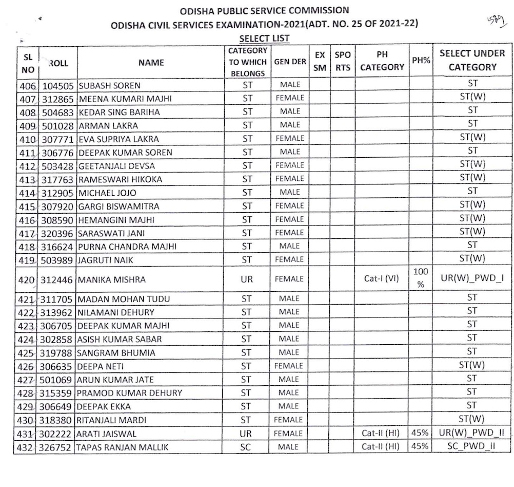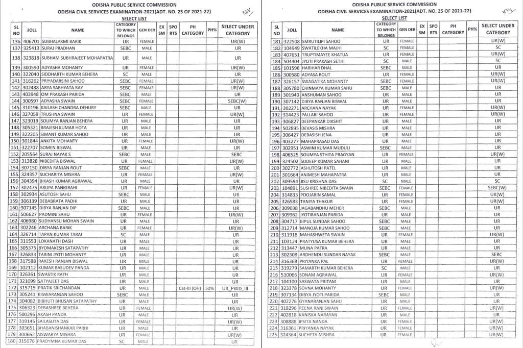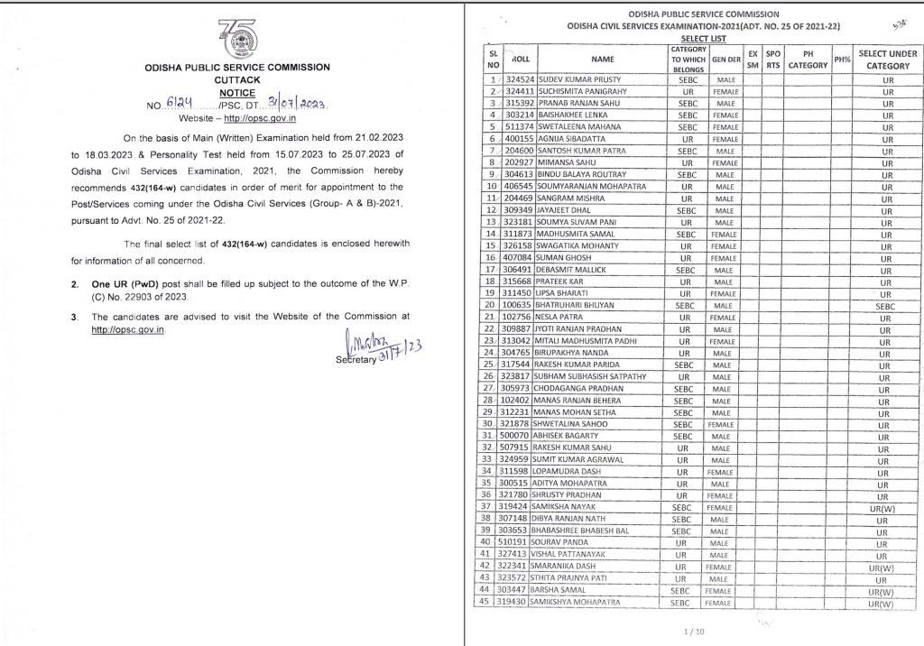 “On the basis of Main (Written) Examination held from 21.02.2023 to 18.03.2023 & Personality Test held from 15.07.2023 to 25.07.2023 of Odisha Civil Services Examination, Services Examination, 2021, the Commission hereby recommends 432 (164-w) candidates in order of merit for appointment to the Post/ Services coming under the Odisha Civil Services (Group- A & B)-2021, pursuant to Advt. No. 25 of 2021-22,” the OPSC notification said.