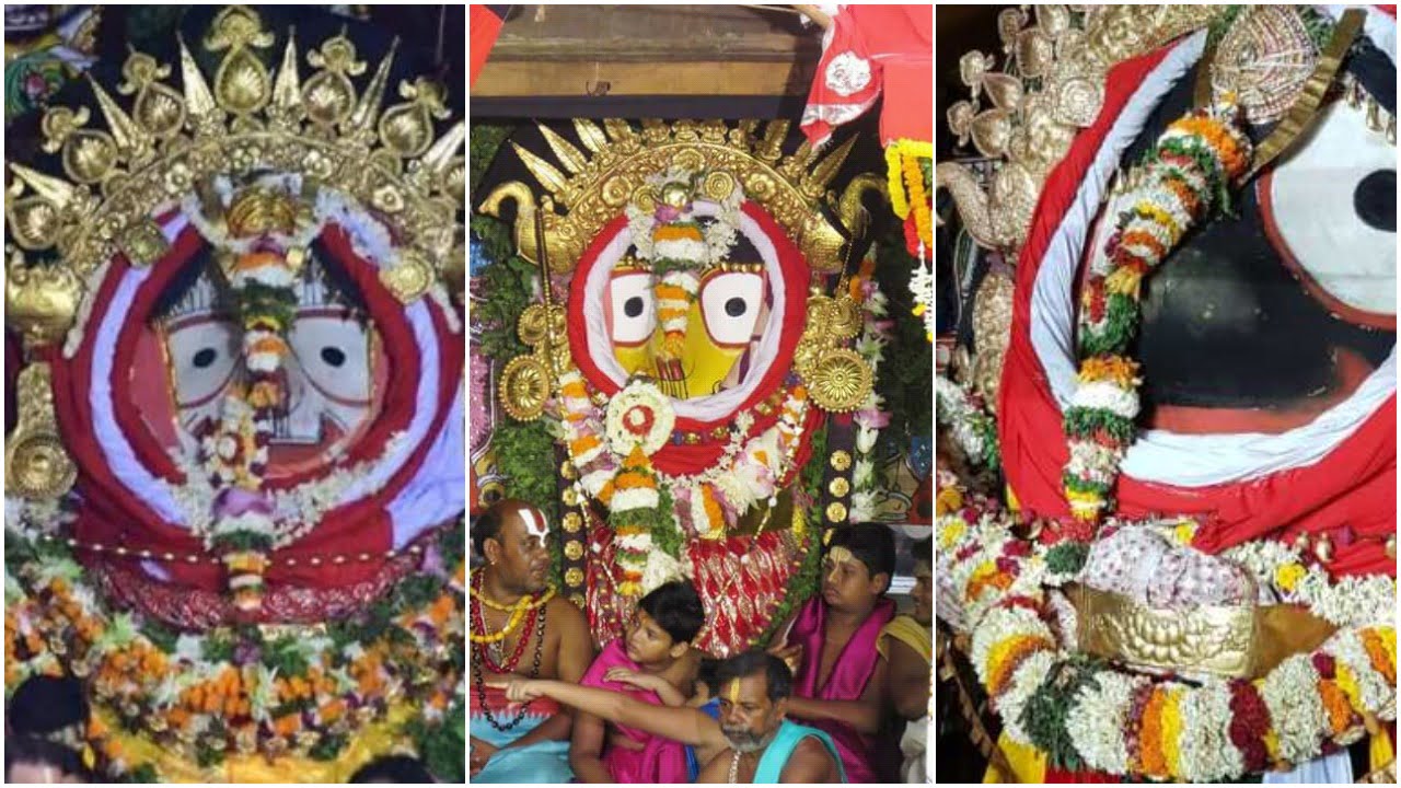Puri: After the homecoming (Bahuda Yatra), devotees got an inkling of Lord Jagannath’s affluence as he, along with His siblings gave darshan in Suna Besha (golden attire) from 4 pm on Thursday.