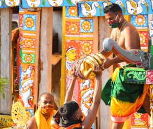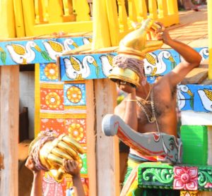 The gold ornaments are stored in the bhandara ghar. Escorted by armed policemen and temple officials, bhandara mekap priests (store in-charge) bring the gold jewellery laced with invaluable stones and hand it over to Puspalaka and Daitapati servitors.