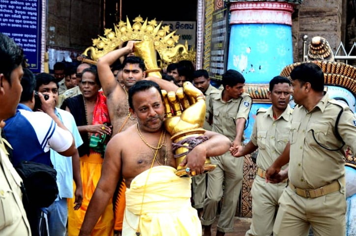 It takes the servitors almost an hour to decorate the Lords with gold ornaments and other jewellery- Sri Hasta (gold hand), Sri Payar (gold feet), Sri Mukuta (big gold crown), Sri Mayur Chandrika (gold peacock feather for Lord Jagannath), Sri Chulapati (an ornament traditionally worn on the forehead), Sri Kundal (gold earring with a hanging ball), Sri Rahurekha (a half square-shaped gold aura), Sri Mala (necklaces), Sri Chita (third eye of Lords), Sri Chakra (gold wheel), Sri Gada (gold bludgeon), Sri Padma (gold lotus) and Sri Sankha (a silver conch).