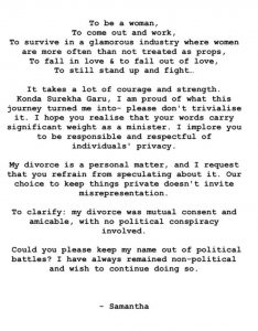 In her post, the minister wrote that she admires the way Samantha has come up in life with self-power. “If you (Samantha) or your fans are offended by my comments, I unconditionally retract my comments,” the minister wrote.