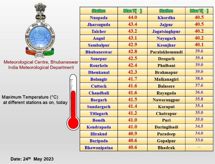 Nuapada was the hottest place in Odisha as the town sizzled under a temperature of 44 degree Celsius. It was followed by Jharsuguda with 43.4 degree, Talcher 43.2, Angul 43.1, Sambalpur 42.9, Bhubaneswar 42.8, Soneput 42.5, Rourkela 42.4, and Dhenkanal 42.3 degree Celsius.