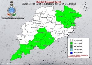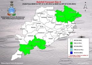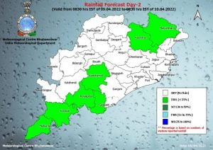Light to moderate rain/ thundershower very likely to occur at one or two places over the districts of Malkangiri, Koraput, Rayagada, Gajapati, Ganjam, Kandhamal, Keonjhar, Mayurbhanj, Balasore, Bhadrak and Jajpur.