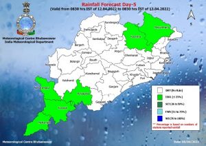 Light to moderate rain/ thundershower very likely to occur at one or two places over the districts of Malkangiri, Koraput, Nabarangpur, Nuapada, Kalahandi, Kandhamal, Boudh, Angul, Keonjhar, Mayurbhanj and Sundargarh.