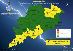 Yellow warning: Thunderstorm with lightning very likely to occur at one or two places over the districts of Koraput, Nabarangpur, Nuapada, Kalahandi, Kandhamal, Keonjhar and Mayurbhanj.
