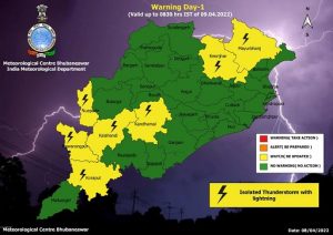 Yellow warning: Thunderstorm with lightning very likely to occur at one or two places over the districts of Malkangiri, Koraput, Rayagada, Gajapati, Ganjam, Keonjhar and Mayurbhanj.