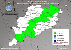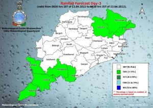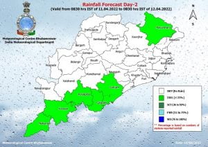 Light to moderate rain/ thundershowers very likely to occur at one or two places over the districts of north coastal Odisha, Mayurbhanj, Keonjhar, Angul, Boudh, Dhenkanal, Sundargarh, Kandhamal, Kalahandi, Rayagada, Nabarangpur and Nuapada.
