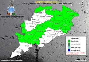 Bhubaneswar: Light to moderate rain accompanied by thundershowers are likely to occur over Odisha till April 15, the regional centre of the India Meteorological Centre (IMD) said in its midday bulletin on Sunday.