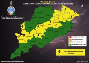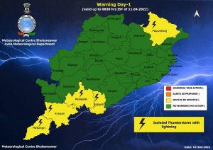 Thunderstorm with lightning very likely to occur at one or two places over the districts of Mayurbhanj, Malkangiri, Koraput, Rayagada and Gajapati.