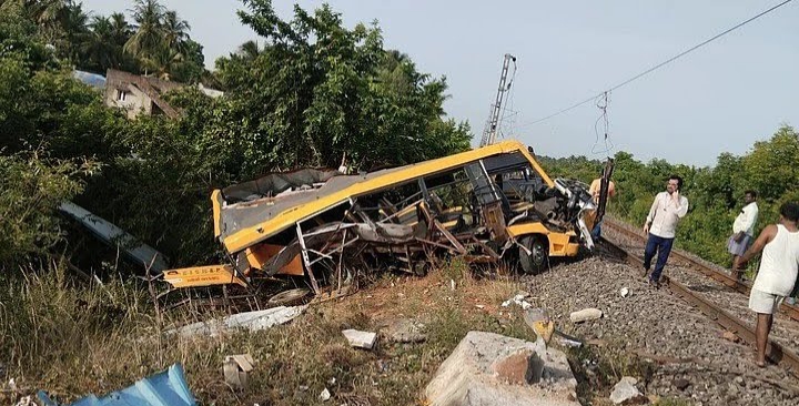The impact was so severe that the bus, belonging to Krishnaswamy School, was dragged approximately 50 metres from the railway tracks.