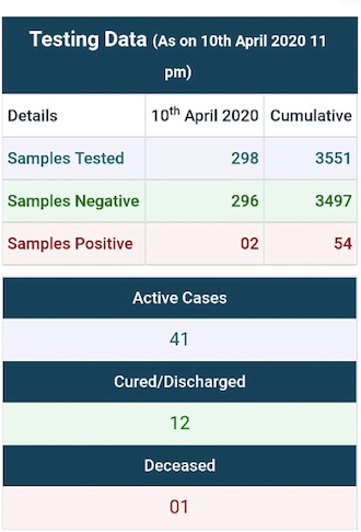The Health and Family Welfare Department tweet also informed about a technical snag on the its official website, which created confusion over the number of positive cases detected on Saturday. While the cumulative number of confirmed cases was 54, it showed that only two samples had tested positive for the virus. The total confirmed cases on Friday was 50. The date still was April 10.