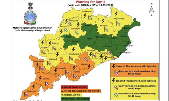 Thunderstorm/lightning with gusty surface wind speed reaching 40- 50 kmph is also likely in the afternoon/evening hours at one or two places in Kalahandi, Nuapada, Balangir, Kandhamal, Nayagarh, Khurda and Puri. There is also a forecast for thunderstorm/lightning with gusty surface wind speed reaching 30- 40 kmph in the afternoon/evening hours at one or two places in Sundargarh, Bargarh, Jharsuguda, Sambalpur, Mayurbhanj and Keonjhar.