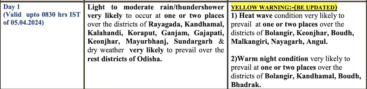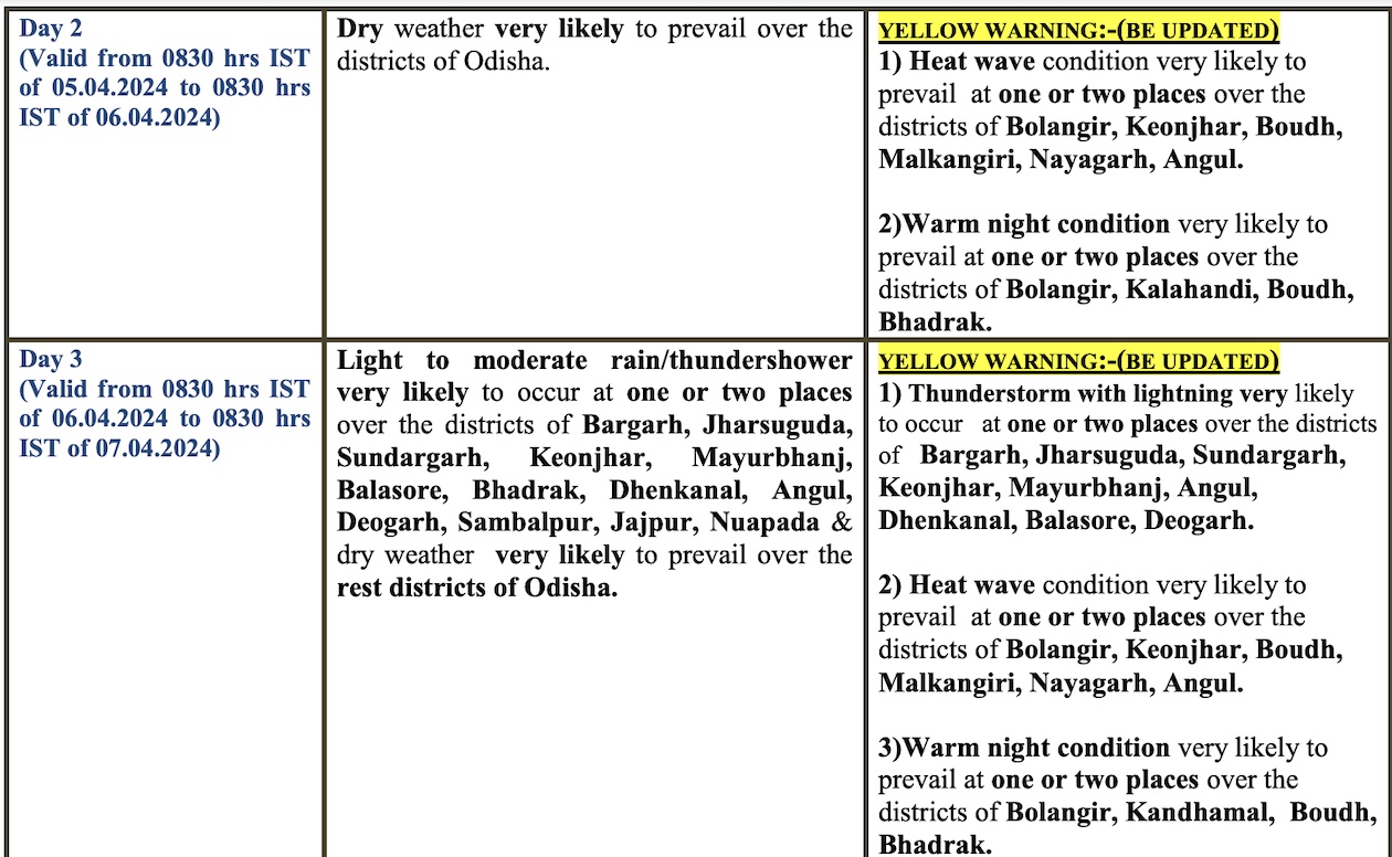 Heatwave warning has been issued for Balangir, Keonjhar, Boudh, Malkangiri, Nayagarh, and Angul districts while warmer nights may prevail in Balangir, Kandhamal, Boudh, and Bhadrak on April 4, 5, 6. “Due to prevailing mainly northwesterly/westerly dry air and high solar insolation, the day temperature is likely to be more than 40°C at many places in Odisha and above normal by 3 to 5°C in some districts till April 6. People are advised to take precautionary measure while going outside during day time between 11 am and 3 pm,”