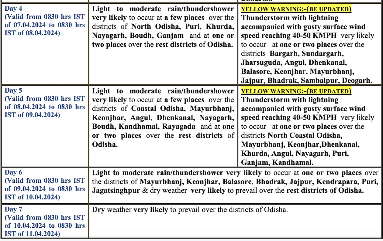 Thunderstorm with lightning very likely may occur at one or two places in Bargarh, Jharsuguda, Sundargarh, Keonjhar, Mayurbhanj, Angul, Dhenkanal, Balasore, and Deogarh on April 6. Thunderstorm with lightning accompanied with gusty surface wind speed reaching 40-50 kmph is likely at one or two places in Bargarh, Sundargarh, Jharsuguda, Angul, Dhenkanal, Balasore, Keonjhar, Mayurbhanj, Jajpur, Bhadrak, Sambalpur, and Deogarh districts on April 7. Similar weather conditions may prevail at one or two places in North Coastal Odisha, Mayurbhanj, Keonjhar, Dhenkanal, Khurda, Angul, Nayagarh, Puri, Ganjam, and Kandhamal during the subsequent 24 hours.