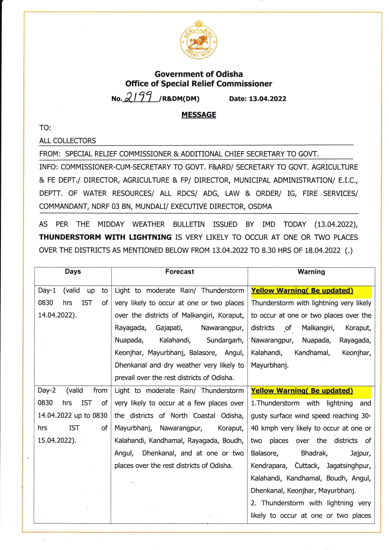 Bhubaneswar: The regional centre of India Meteorological Department here has issued thunderstorm/lightning warning for several districts of Odisha till 8.30 am on April 18.