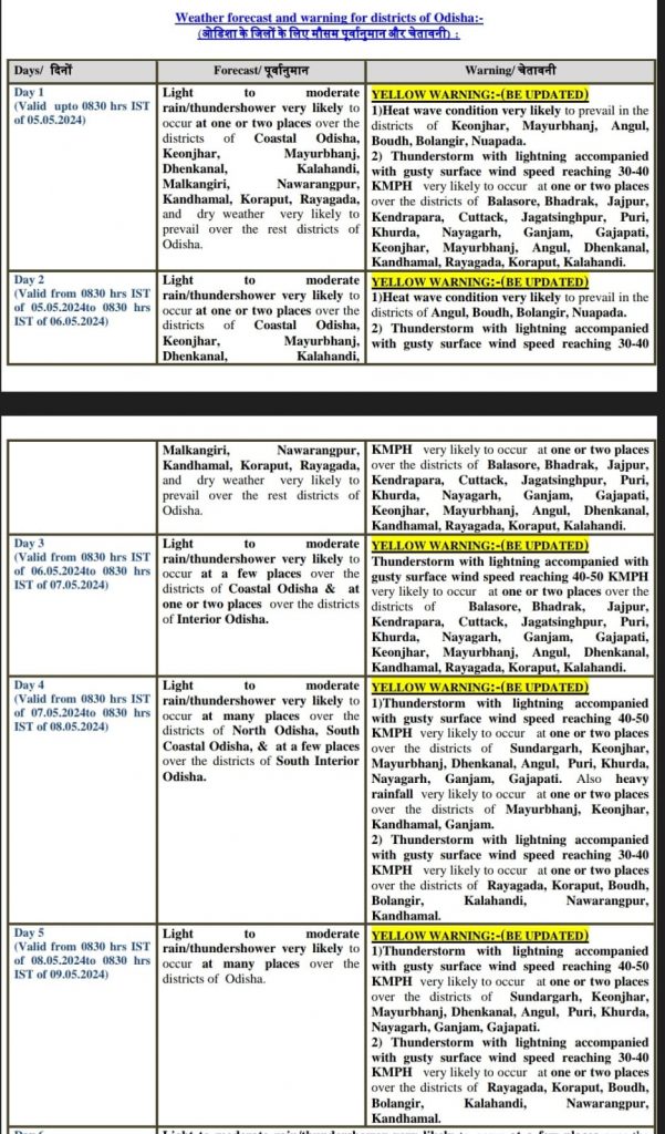 Thunderstorm with lightning accompanied by gusty surface wind speed reaching 30-40 KMPH may to occur at some places of Balasore, Bhadrak, Jajpur, Kendrapada, Cuttack, Jagatsinghpur, Puri, Khurda, Nayagarh, Ganjam, Gajapati, Keonjhar, Mayurbhanj, Angul, Dhenkanal, Kandhamal, Rayagada, Koraput, and Kalahandi.