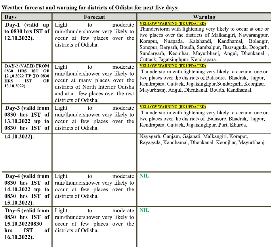 A similar warning has been issued for Balasore, Bhadrak, Jajpur, Kendrapada, Cuttack, Jagatsinghpur, Sundargarh, Keonjhar, Mayurbhanj, Angul, Dhenkanal, Boudh and Kandhamal districts from 8.30 am on October 12 till 8.30 am on October 13 and again for Balasore, Bhadrak, Jajpur, Kendrapada, Cuttack, Jagatsinghpur, Puri, Khurda, Nayagarh, Ganjam, Gajapati, Malkangiri, Koraput, Rayagada, Kandhamal, Dhenkanal, Keonjhar, Mayurbhanj districts from 8.30 am on October 13 till 8.30 am on October 14.