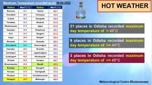 The IMD recorded maximum temperature of 40 degree or more at 21 places and 44 degree or more in 9 places. Jharsuguda recorded 44.9 degree Celsius, followed by Sonepur with 44.7, Angul 44.5, Bargarh 44.4, Sambalpur 44.3 and Sundargarh 44 degree.