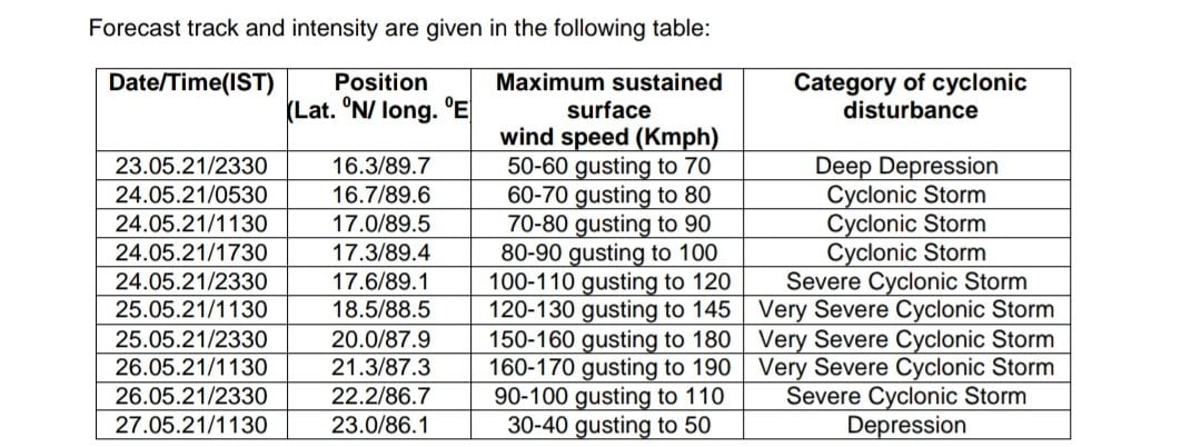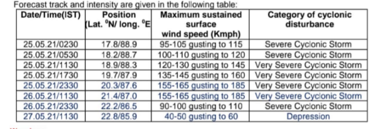 6 PM: Squally wind speed reaching 40-50 kmph gusting 60 kmph would prevail in Ganjam, Khurda, Cuttack, Jajpur and Mayurbhanj districts of Odisha and Howrah, Hooghly, north 24Parganas Districts of West Bengal from the evening of May 25. It would further increase becoming gale wind speed 155-165 kmph gusting to 185 kmph over northwest Bay of Bengal and along and off north Odisha and adjoining West Bengal coasts, including Jagatsinghpur, Kendrapada, Bhadrak, from early hours of May 26 and will extend to Balasore district of Odisha from the forenoon, 120-130kmph gusting to 145 kmph would prevail in Mayurbhanj district during the same period. Gale wind speed reaching 80-90 kmph gusting to 100 kmph would prevail over Puri, Cuttack, Khurda, Jajpur and Nayagarh districts of Odisha during the same period. The wind speed reaching 60-80 kmph gusting to 90 kmph would prevail along and off Ganjam and the remaining interior districts of north Odisha.