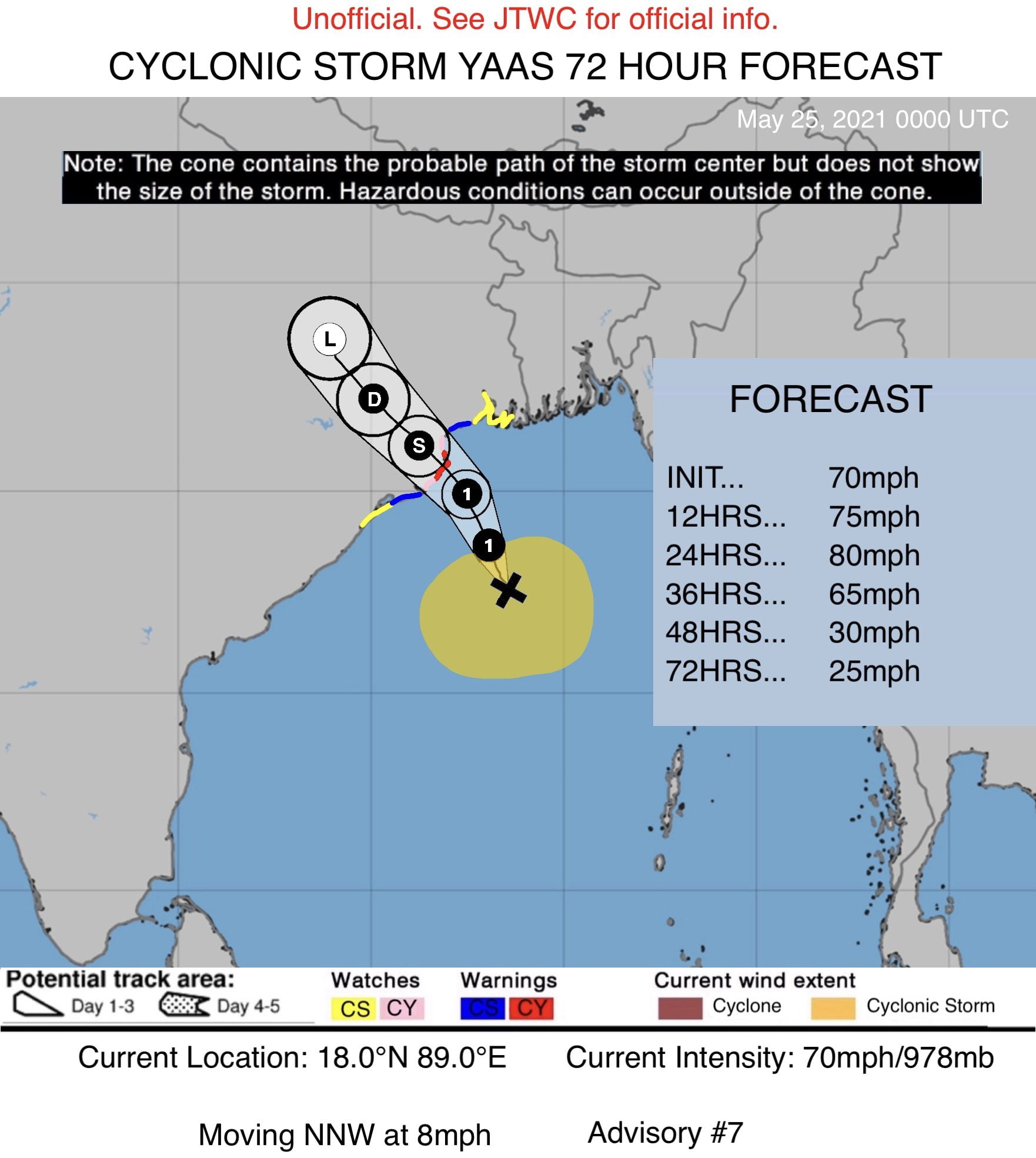 6 am: The Indo-Pacific Tropical Cyclone Warning Centre said that Yaas was gradually strengthening. Maximum wind speed has increased to 70mph. It is expected to intensify slightly more before landfall in Odisha in 30 hours as a dangerous cyclone capable of producing widespread storm surge impacts, and inland flooding.