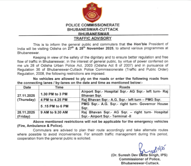 Bhubaneswar: In view of the two-day visit of President Droupadi Murmu to Odisha, the Commissionerate Police has issued a traffic advisory for Bhubaneswar on November 27 and 28.