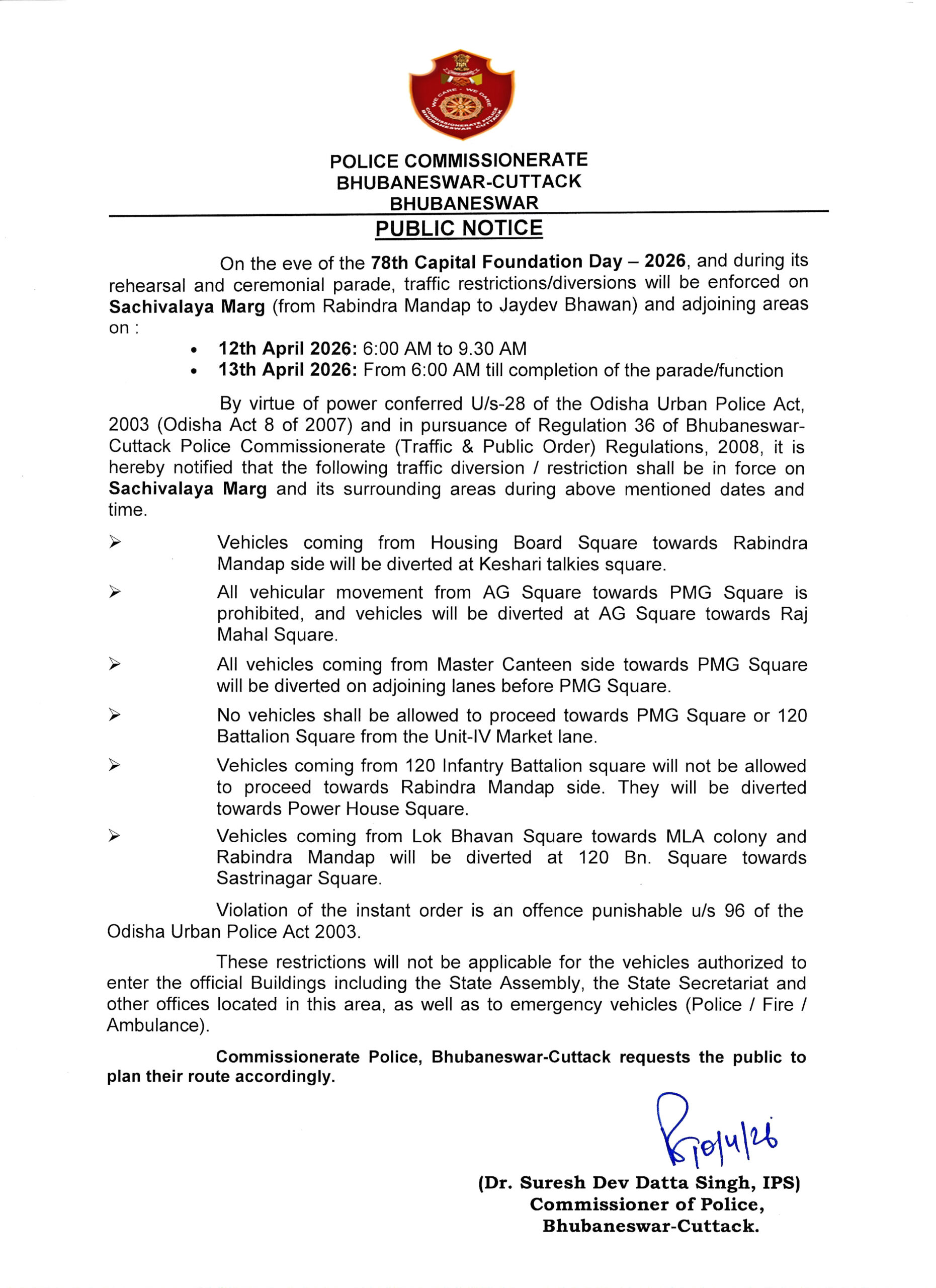 These traffic arrangements have been put in place under Section 28 of the Odisha Urban Police Act, 2003, and in pursuance of Regulation 36 of the Bhubaneswar-Cuttack Police Commissionerate (Traffic & Public Order) Regulations, 2008.