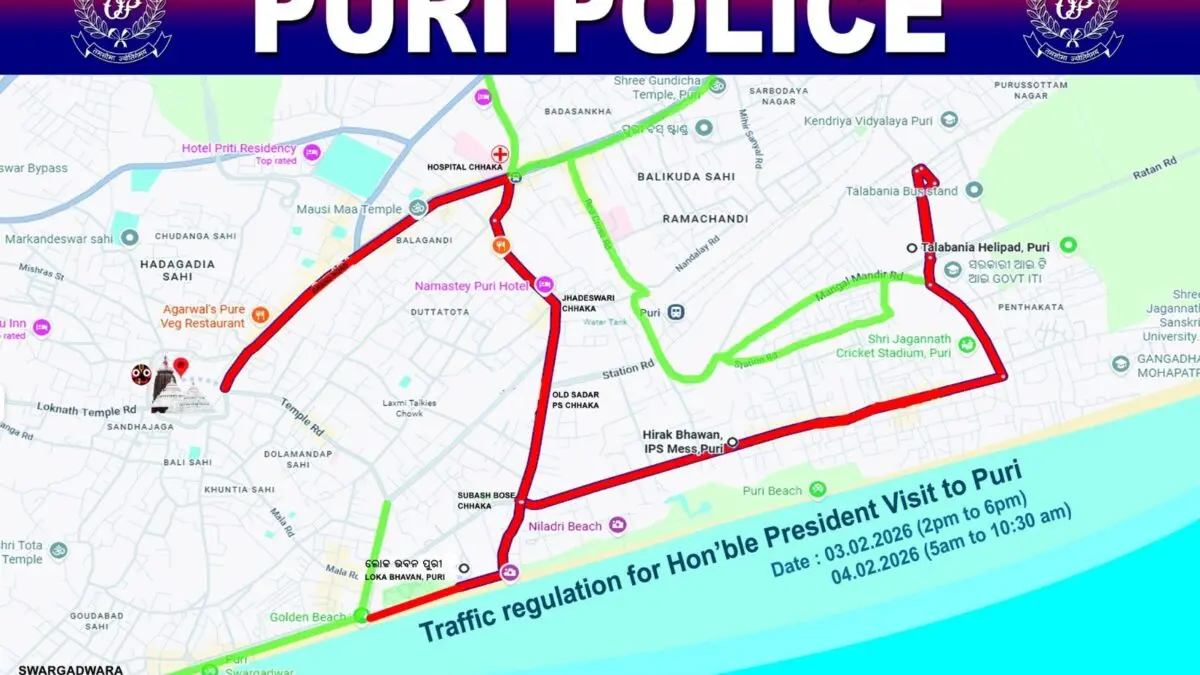 Puri: Elaborate security measures have been taken and traffic restrictions imposed in Odisha’s Puri town to ensure security and smooth movement during the visit of President Draupadi Murmu on February 3 and 4.