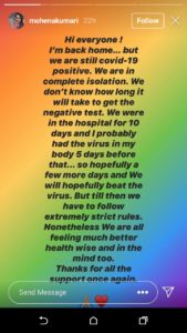 Mohena posted, “Hi everyone ! I’m back home… but we are still COVID-19 positive. We are in complete isolation. We don’t know how long it will take to get the negative test. We were in the hospital for 10 days and I probably had the virus in my body 5 days before that… so hopefully a few more days and We will hopefully beat the virus. But till then we have to follow extremely strict rules. Nonetheless, we are all feeling much better health-wise and in the mind too. Thanks for all the support once again.”