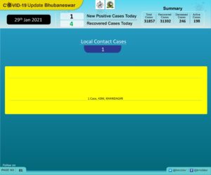 According to Bhubaneswar Municipal Corporation (BMC) the lone positive case was identified in Khandagiri. The 34-year-old male was affected through local contacts. Four persons have recovered from the disease.