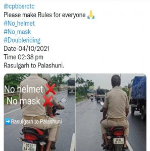A Twitter user, who had paid penalty for violating the rules, shared a photo of the police personnel travelling on the bike without wearing helmets and face masks from Rasulgarh to Palasuni in the city recently.