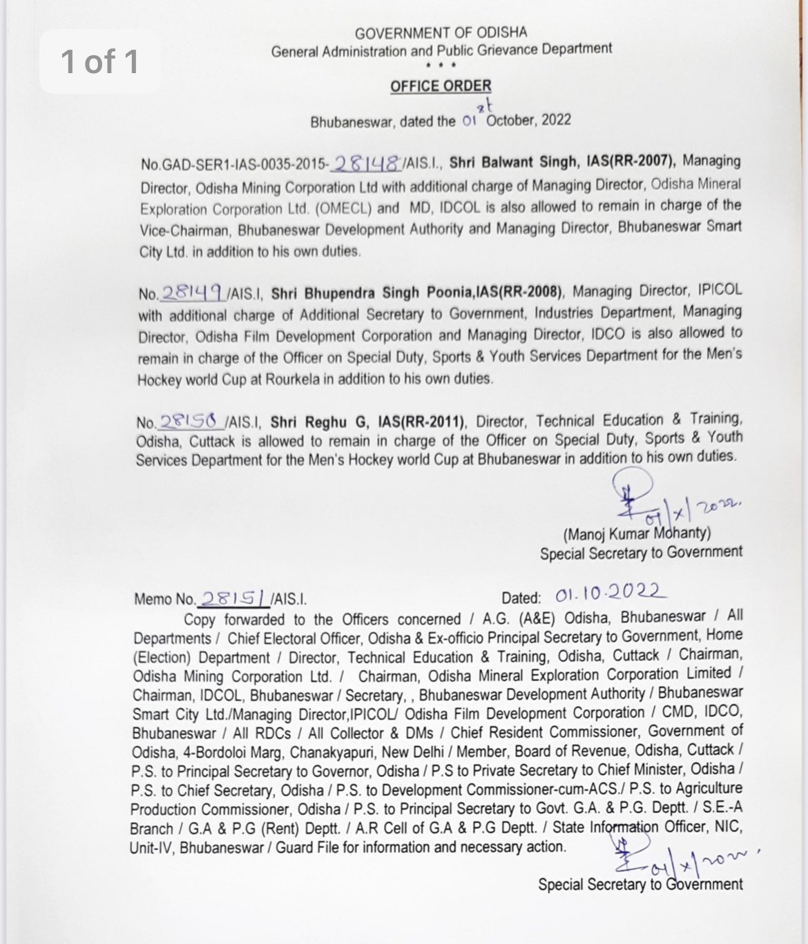 While 2007-batch officer Bhupendra Singh Poonia will be in charge of the quadrennial world championship at Rourkela, 2011-batch officer Reghu G has been assigned Bhubaneswar in addition to his duties.