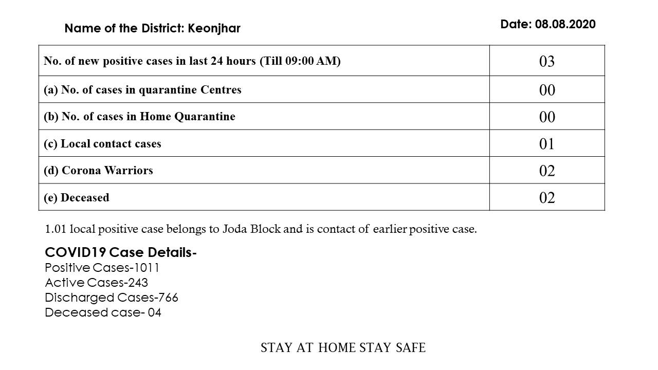 With four deaths and 766 recoveries, Keonjhar district now has 243 active cases.