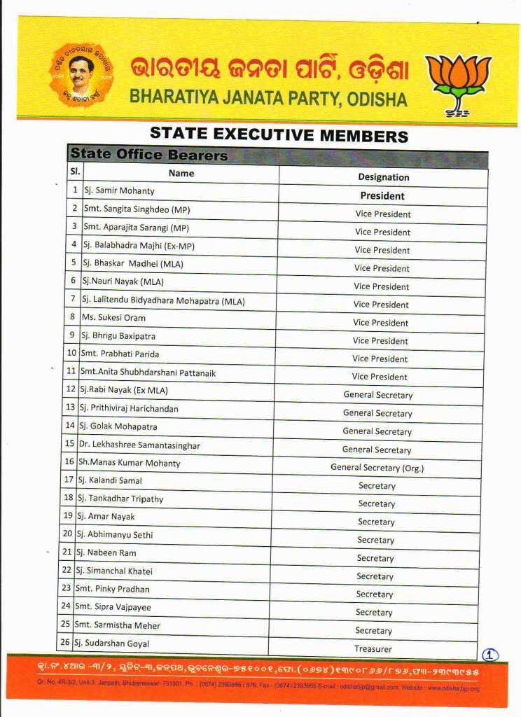After four months of being elected to the top post of the state unit of the saffron party, Samir Mohanty reconstituted his team with 10 vice-presidents, five general secretaries and nine secretaries on Thursday.