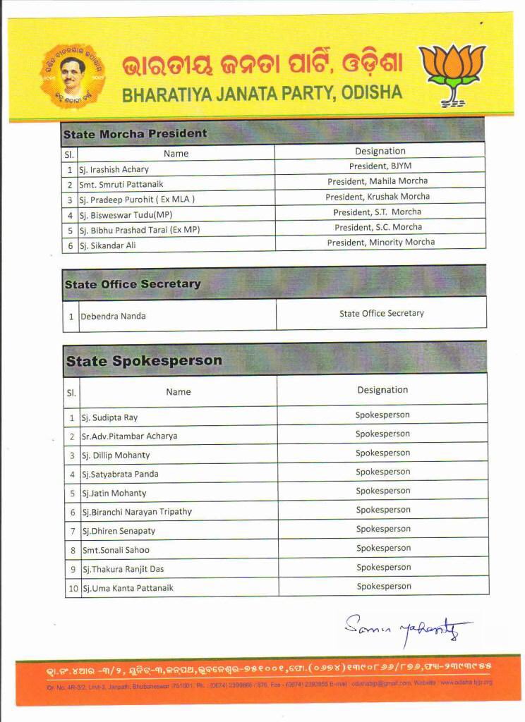 Following the approval of National President JP Nadda, the party also announced names of 10 spokespersons, 161 state permanent invitees and 30 special invitee members. Irashish Acharya is the new president of BJYM, while Smruti Patnaik will lead the Mahila Morcha of the party in Odisha.