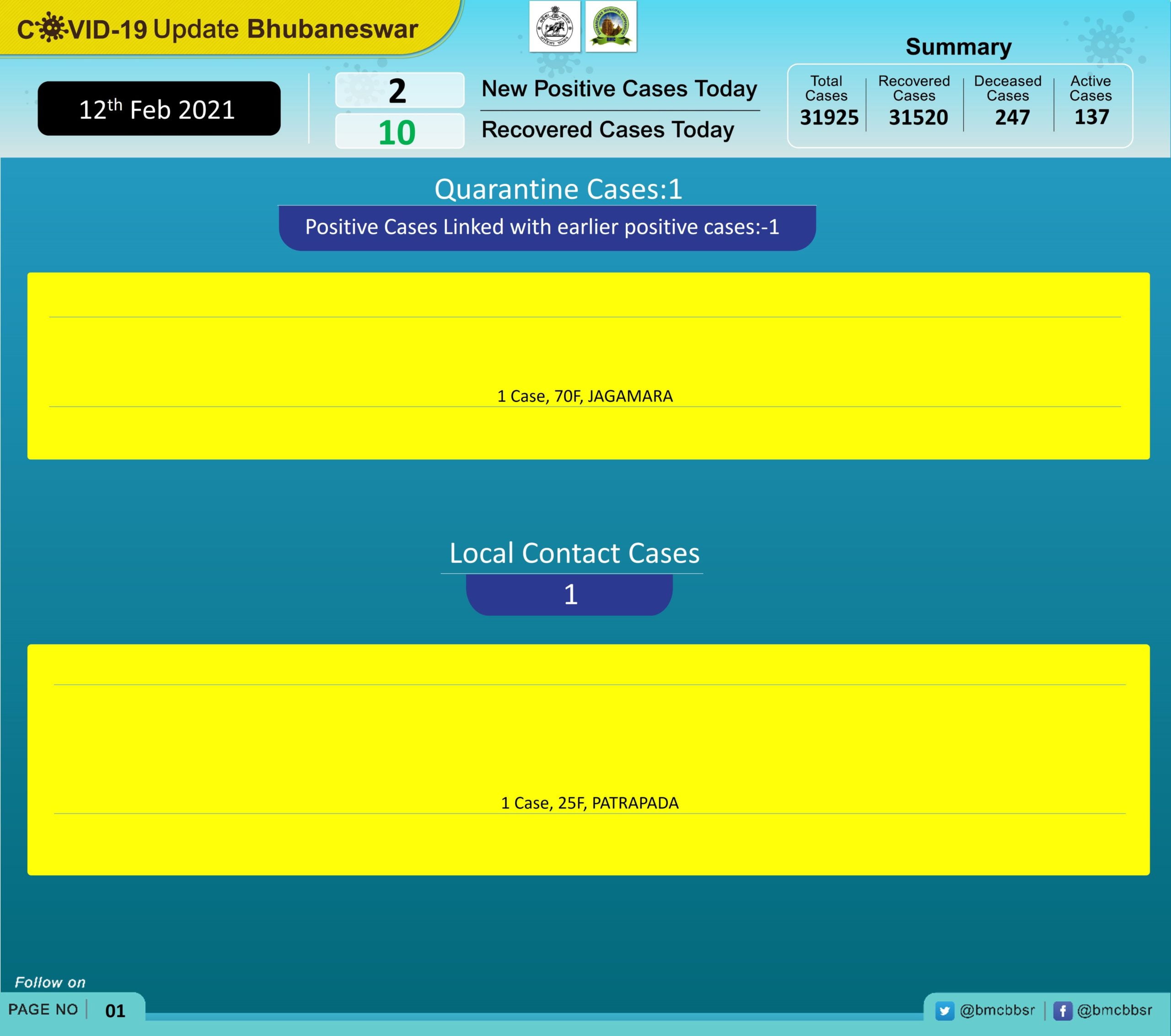 A total of 31,925 people have been infected by the novel coronavirus in Bhubaneswar so far, of which 31,520 have recovered. While 247 have succumbed to the disease, there are 137 active cases at present.