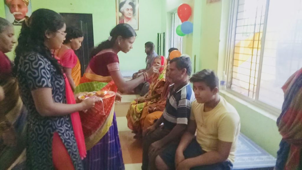 Raksha Bandhan was celebrated at the old age home in a traditional way. The hall was decorated nicely. The entrances too were decked with flowers.