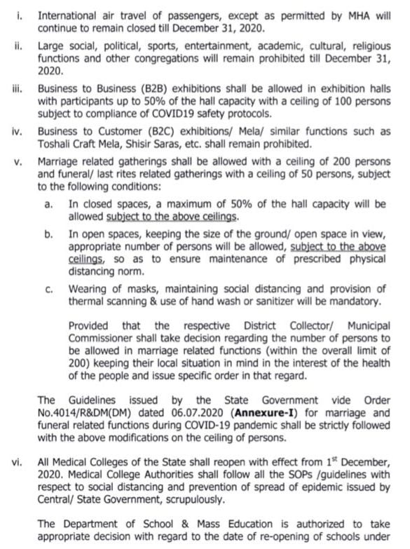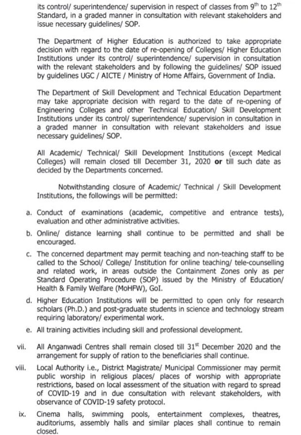 >> All academic/technical/skill development institutions (except medical colleges) to remain closed till December 31 or till such date as decided by the department concerned.
