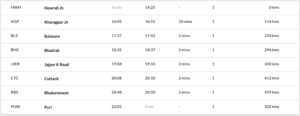 >> 12277 Howrah-Puri Shatabdi leaves Howrah Jn at 2.25 pm and arrives at Puri station at 10.05 pm while the new Vande Bharat Express, numbered 22895, will depart from Howrah at 6.10 am and arrive at Puri at 12.35 pm.